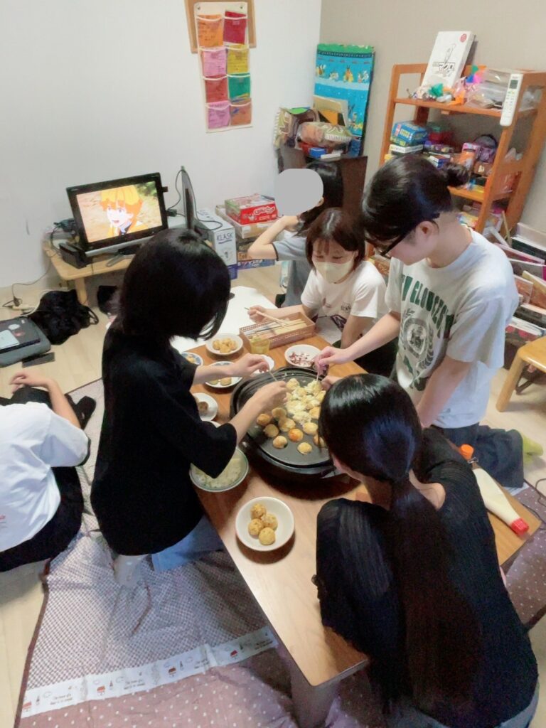 この日の夕食はたこ焼きをみんなで作りチーズやおもち、ベーコンなどタコ以外の具材をたくさん入れました🐙高校生の女の子はたこ焼きをまわすのがとても上手でみんなで「めっちゃきれいな丸のたこ焼きや!」「上手い!」と言い合いながら楽しく過ごしていました😊