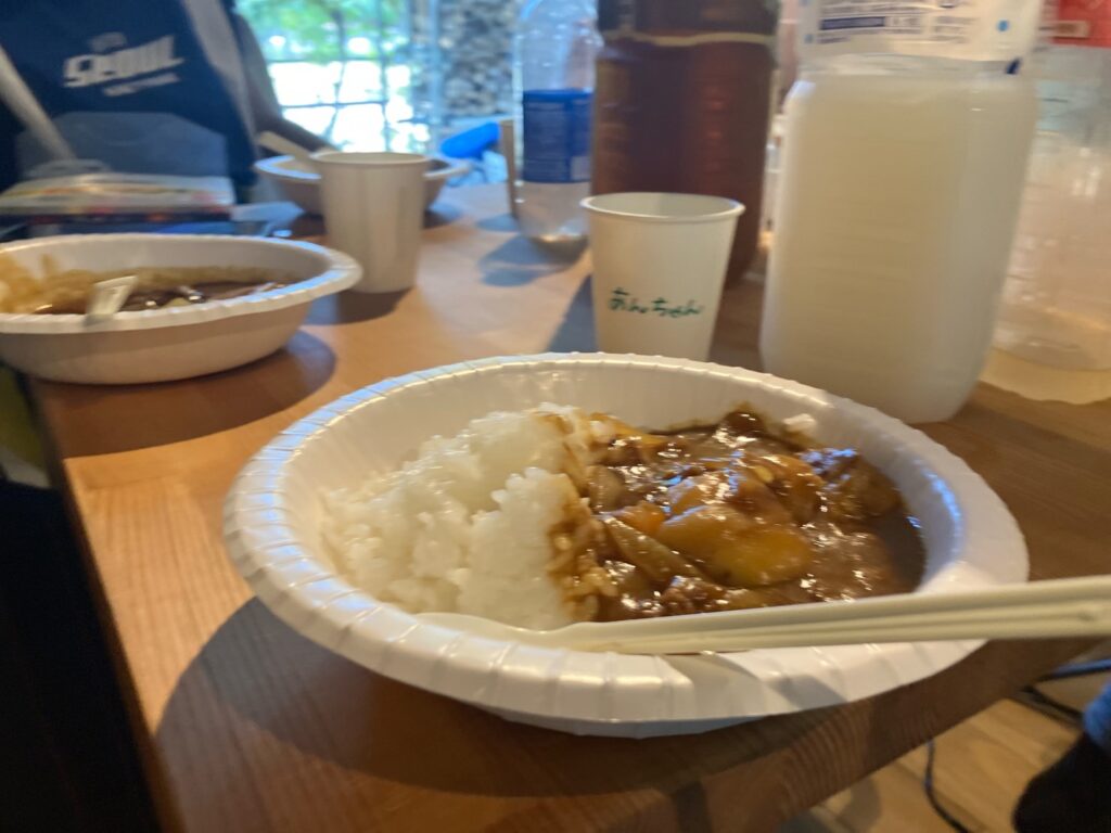一日目、合宿のベースキャンプ地である「生きる場」にて、お昼ご飯にゆっきー特性のカレーライスをみんなで食べました!美味しかったー!