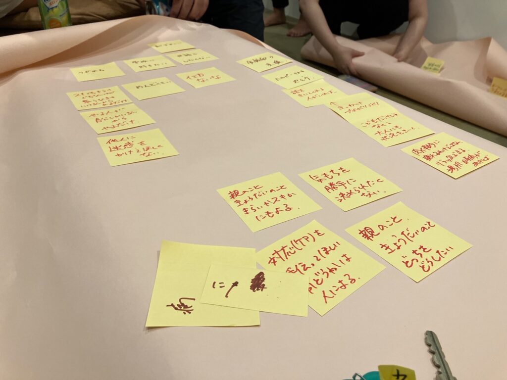 ヤングケアラーはどんな気持ちで過ごしているのか、あったらいいなと思うサポート、ヤングケアラーと聞いてどう思うかをそれぞれ付箋に書き出し、模造紙にまとめました。自身の考えや思いを文字にして見える化し、グループで共有しながら、真剣にワークに向き合う様子が見られました!