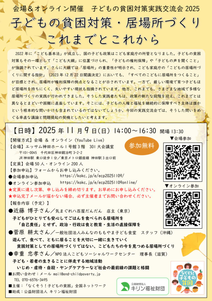 講演・研修 2025.10.05 子どもの貧困対策実践交流会(2025年11月9日) なくそう子どもの貧困全国ネットワーク主催の「子どもの貧困対策実践交流会」にて、こどもソーシャルワークセンター理事長の幸重が「子ども・若者の生きることに伴走する地域活動」というテーマで実践報告を行います。全国の実践家と共に、子どもの人権と福祉を継続的に保障すべき主体は誰かという根本的な問いかけに、こどもソーシャルワークセンターでの10年間の実践から会場の参加者にこどもの声や姿を伝えていきます。東京会場だけでなくオンラインでのライブ配信も行われるので、多くのみなさんの参加をお待ちしています。