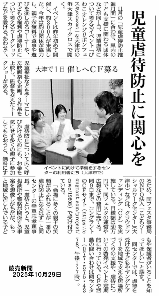 読売新聞に11月1日に開催される「びわこオレンジリボンフェスタ」の告知記事が掲載されました。当日の遊びコーナーの準備をしている高校生とボランティアの写真も紹介されています。