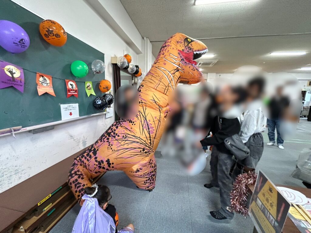 女子メンバーはハロウィンメイクと衣装でばっちりきめてきました。男子高校生は、ティラノザウルスの着ぐるみをきて客寄せをしてくれました。こどもたちに好評で、写真撮影もおこなわれました。中には、怖くて泣きだす子もいました。(ごめんね)