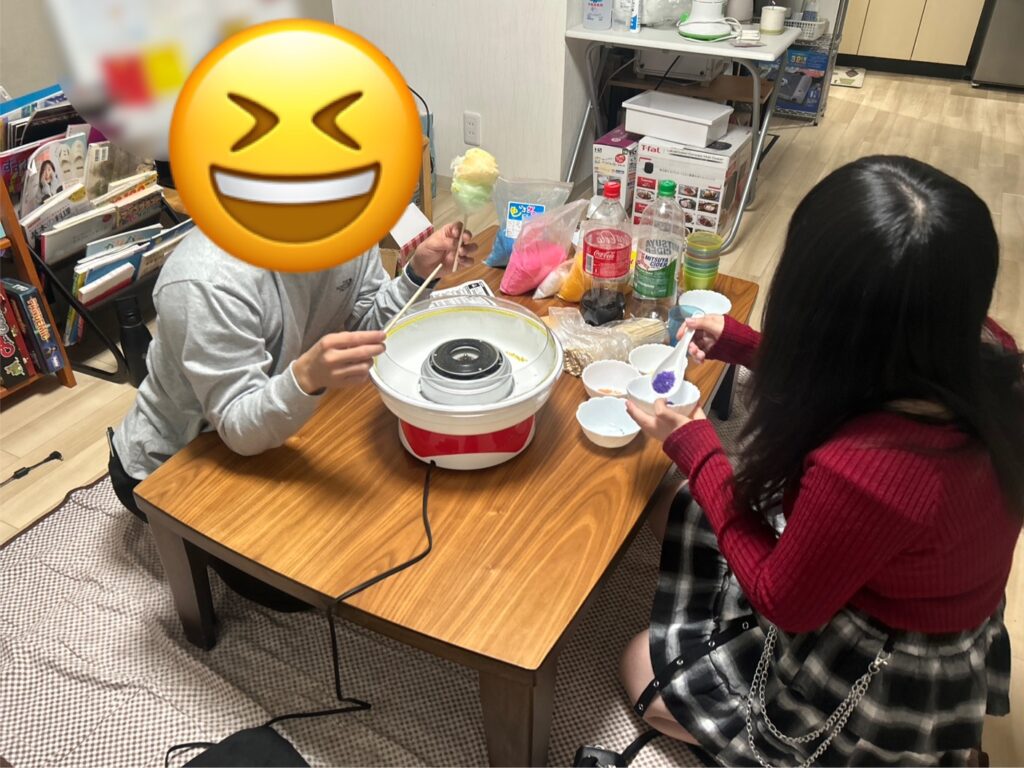 トワイライトステイでは、女の子と実習生で楽しく綿菓子作りをしました。まるで原宿にいるようなカラフルな綿あめづくりに実習生も女の子もテンションが上がり、みんなでわいわい楽しく、大量の綿あめを食べていました。おいしかったようです😁