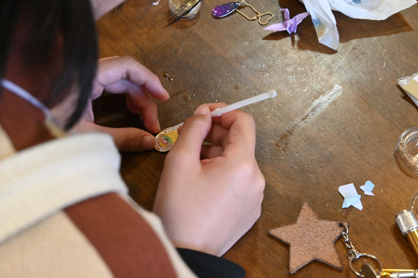 ヤングケアラーの参加者に一番人気のプログラムは、それぞれのペースでものづくりを楽しむこのワークショップでした。レジンを使ったアクセサリーづくりの講師は、大阪のヤングケアラー支援団体ふうせんの会ピアスタッフしゅんさんが担当。おしゃべりも楽しみながら、素敵なアクセサリーが作られていました。そして滋賀県で活躍するコラージュアーティストのとのいけこーたさんが講師のコラージュ作品づくりは、午前中は個人作品。午後は最終日の集合写真用の横断幕づくりをしてくれました。作品をつくりながら、おしゃべりも弾んでいるヤングケアラー姿も。