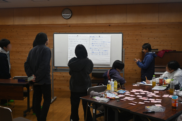 夜の報告会は、暖房にない寒い体育館が会場でしたが、二日目を通して行った四つのアートワークショップの発表(ゲーム、展覧会、演奏、動画視聴)を通して、ほんわかした素敵な気持ちのまま最後の夜は更けていきました。