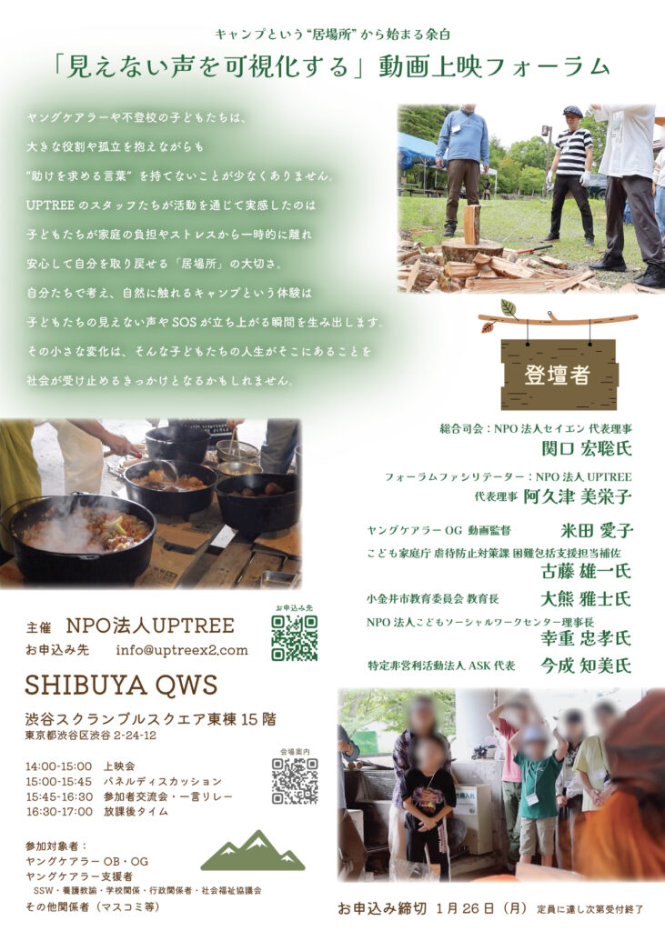 東京小金井市で家族介護者をサポートする活動をしているNPO法人UPTREE主催の支援者向けのヤングケアラーフォーラムに理事長の幸重がパネルディスカッションで登壇します。「見えない声を可視化する」