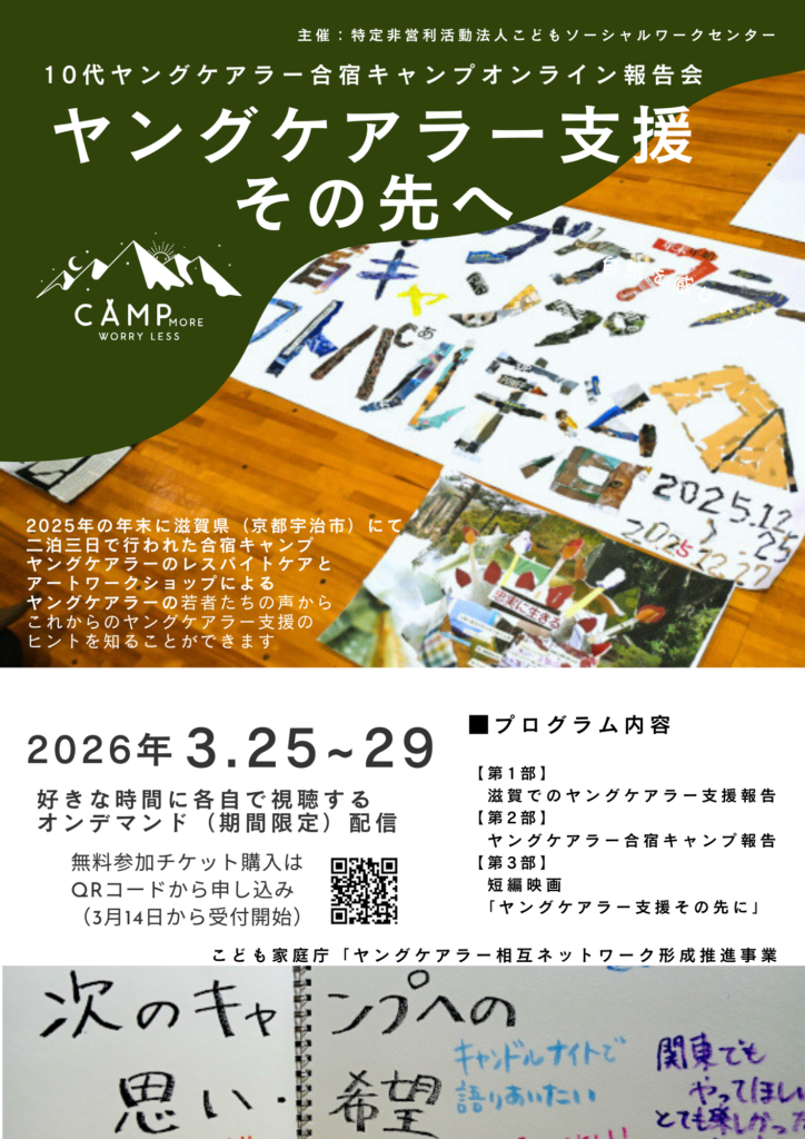 ヤングケアラーのレスパイト支援のモデル事業として、また声の届きにくいタイプのヤングケアラーの若者の声をアートで表現した新たなプログラムを、これからのヤングケアラー(そして何らか生きづらさを抱えるすべてのこども若者)支援のメニューとしての成果と課題を動画コンテンツを活用して伝えるイベントです。